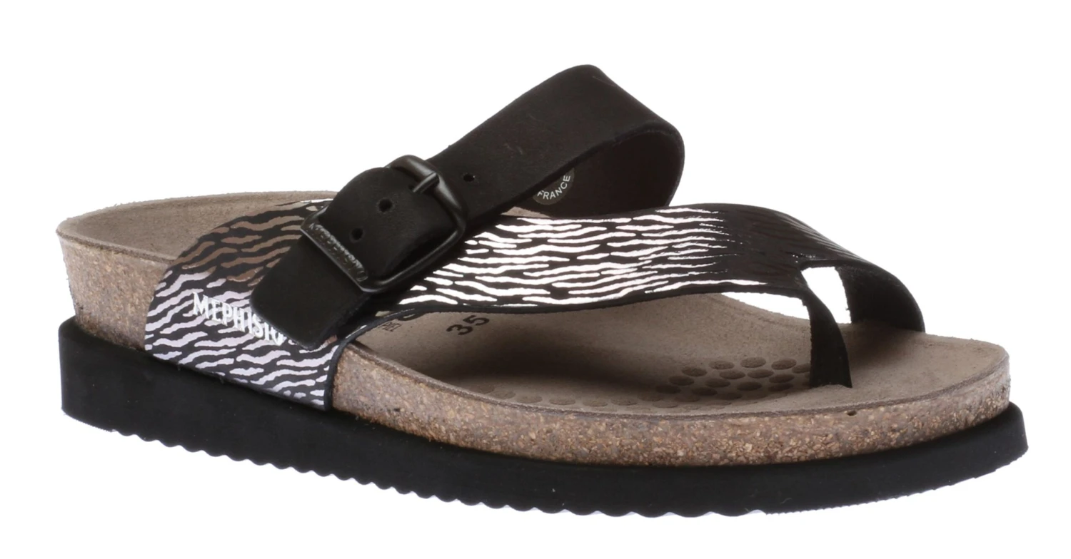 Make a statement with the beautiful Helen Zebra thong sandal by Mephisto! Ultra-comfortable with its anatomic correct footbed, cork midsole and multi-layered footbed integrated with Soft-Air Technology to reduce shock, it’s hard for any other sandal to compete. An adjustable instep strap ensures a secure fit, a thin toe post helps eliminate irritation and an EVA outsole absorbs shock and reduces stress put on your feet, legs and back. Try these Mephisto sandals and never look back!
