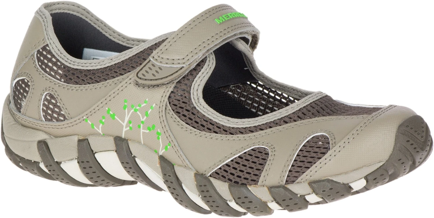 These Waterpro Pandi Mary Jane water shoes are designed for hiking in wet and dry environments. This highly breathable and trail-capable Mary Jane features a quick-drying synthetic leather and mesh upper that enables instant draining for a comfortable wear. A Lycra® and neoprene collar provides padded comfort while a hook-and-loop strap with Velcro closure ensures a secure custom fit. The interior features a removable Kinetic Fit™ BASE contoured insole and a molded nylon arch shank for flexible support. Merrell air cushion in the heel absorbs shock and adds stability. A durable Vibram non-marking sipped rubber sole is enhanced with 3.5 mm lugs to deliver stable slip-resistant grip and traction.
